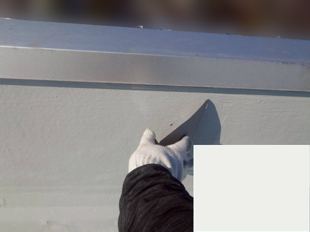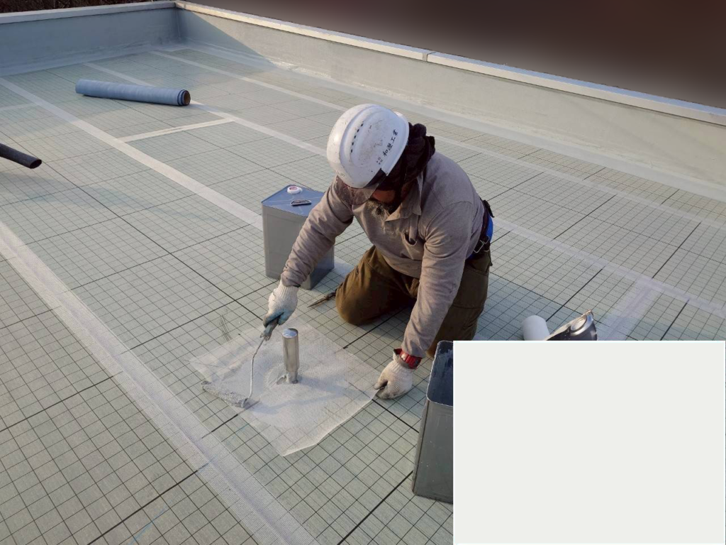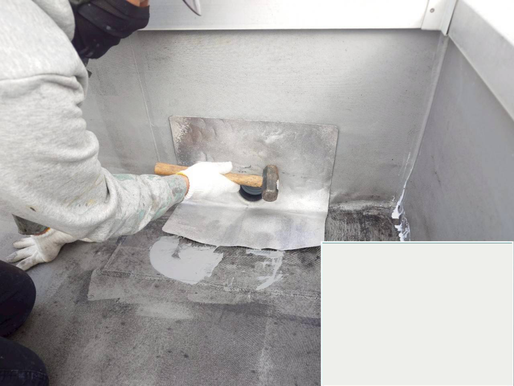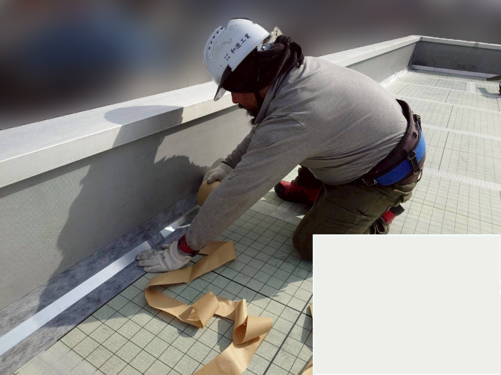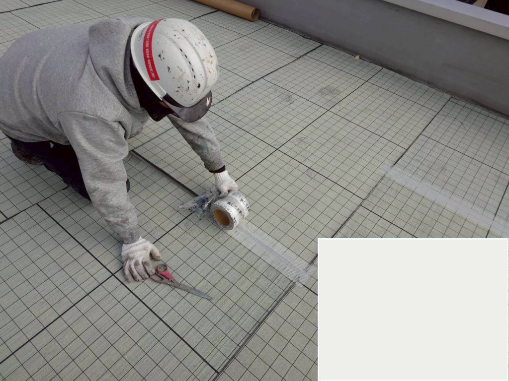 次に、平場に自着シートおよびジョイントテープを貼り、端末にはコーナーキャント取付、FJテープ貼りを行なっていきます。