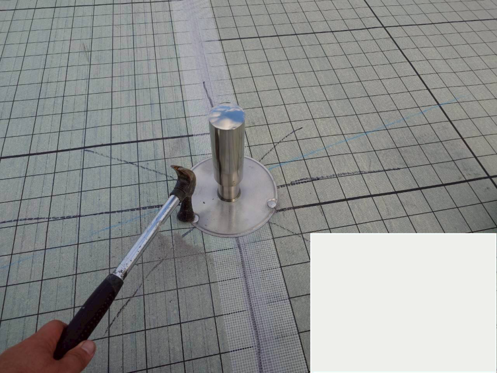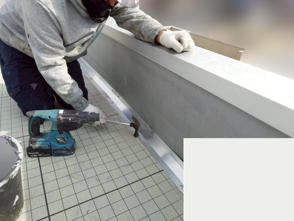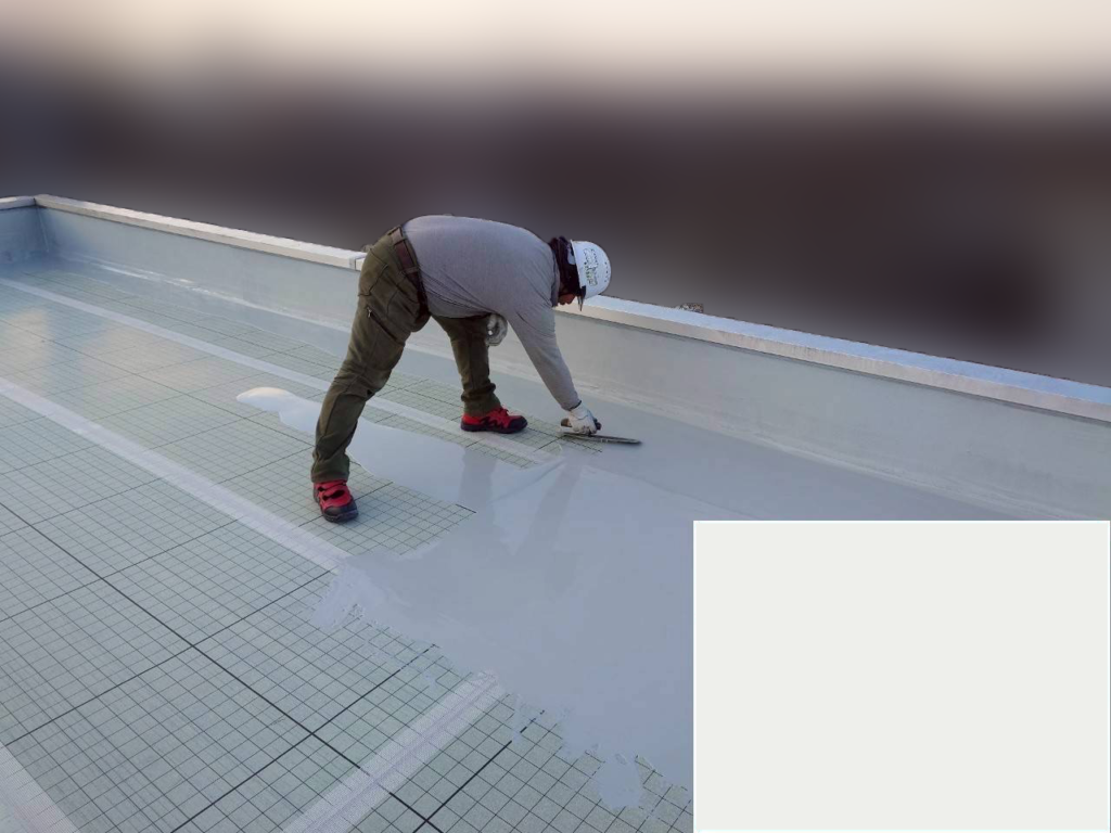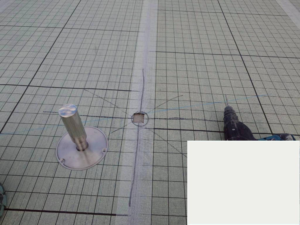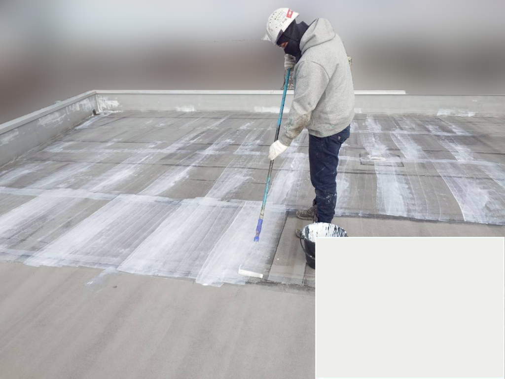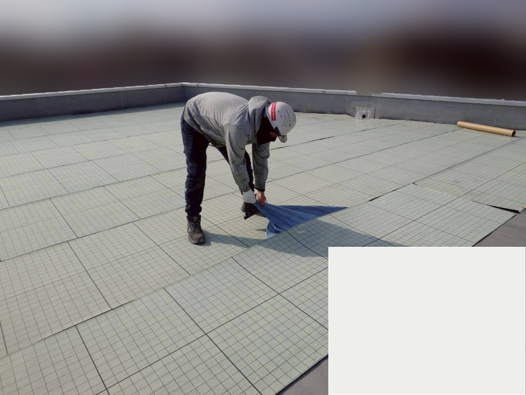 次に、平場に自着シートおよびジョイントテープを貼り、端末にはコーナーキャント取付、FJテープ貼りを行なっていきます。